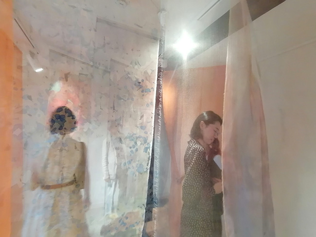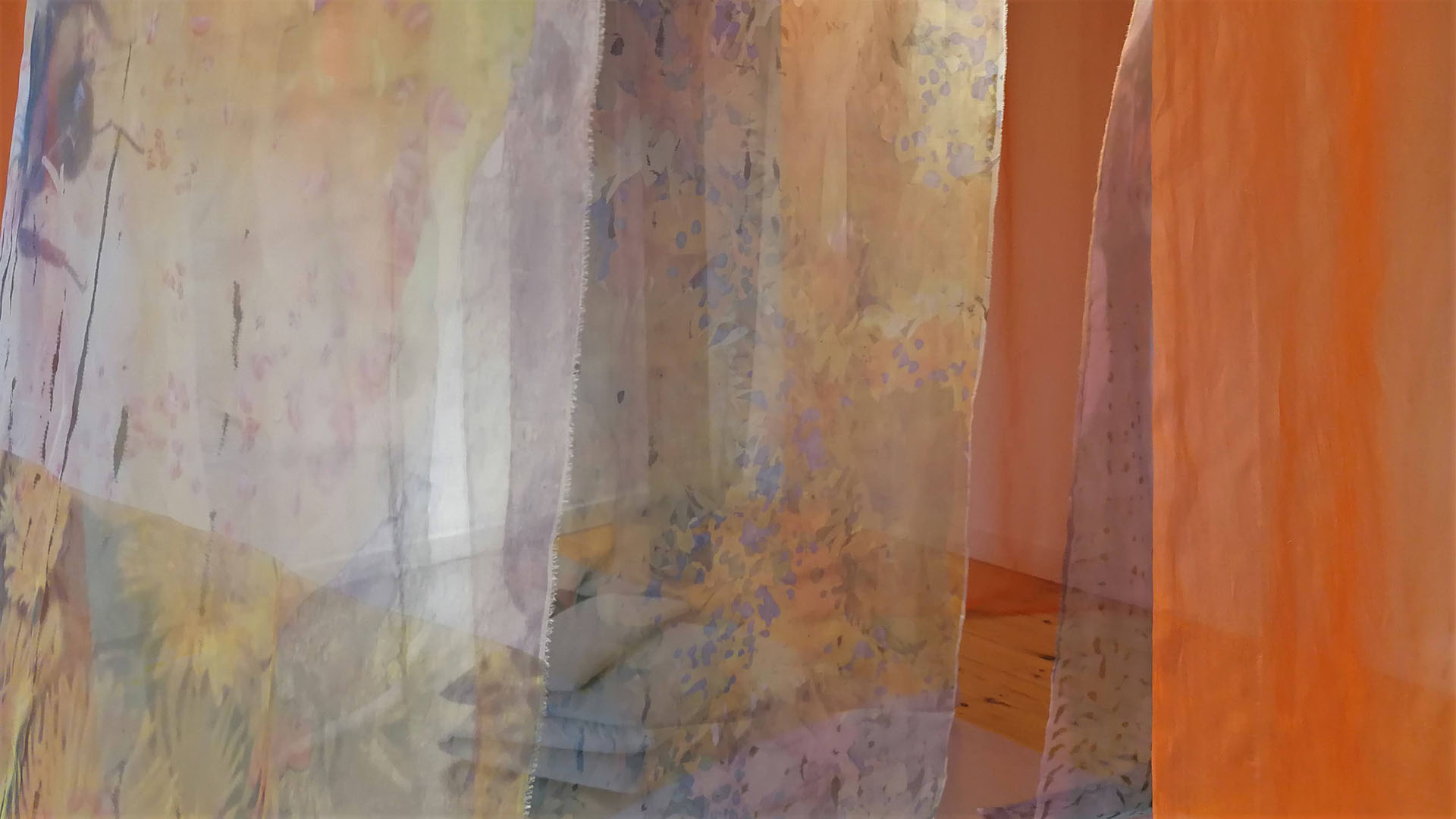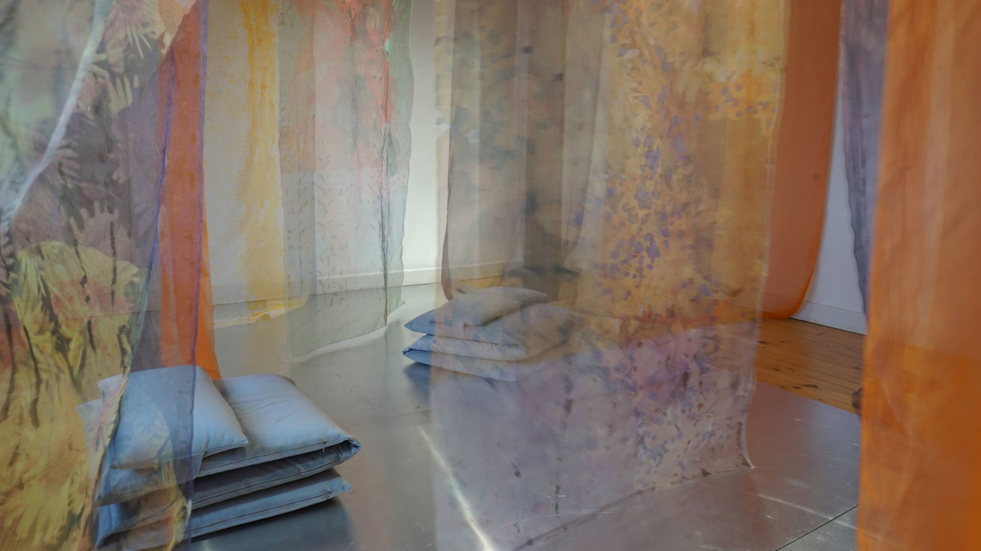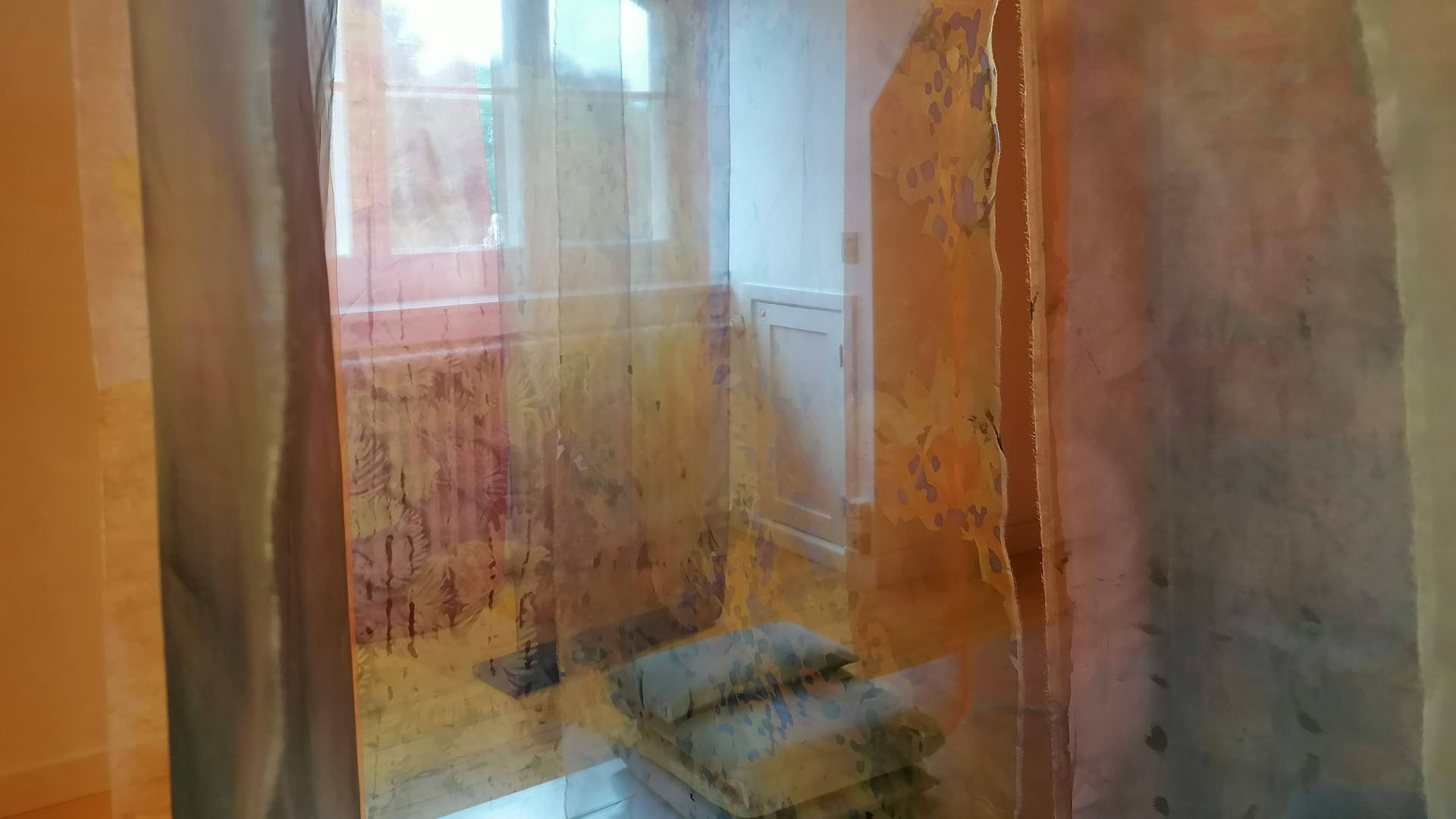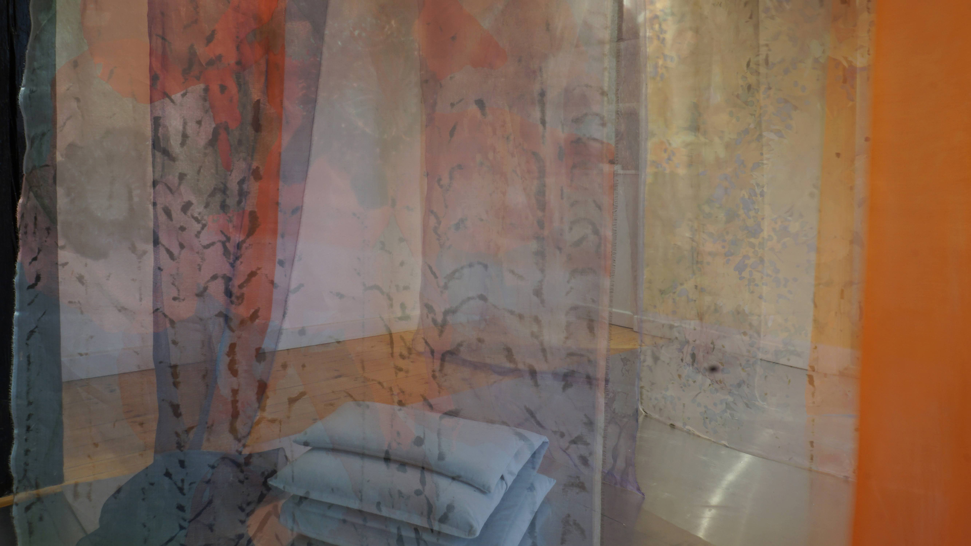 The textile installation  My Garden is based on photos from my garden in Vanløse, photographed during the changing seasons. The motives are printed and painted on transparent organza silk. It is always possible to go into the installation since the meeting between body and textile is crucial in my textile installations. It is also possible to lay down on the pillows between the Organza silk banners and feel the light breeze and enjoy the installation and listen to Nigel Goulding’s music specially composed for the installation.24 printed, hand-dyed and painted organza silk banners.